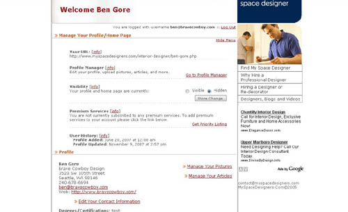 Project description: Implemented a system where interior designers can create profiles similar to a Facebook or MySpace profile. Also implemented public-facing search functionality.